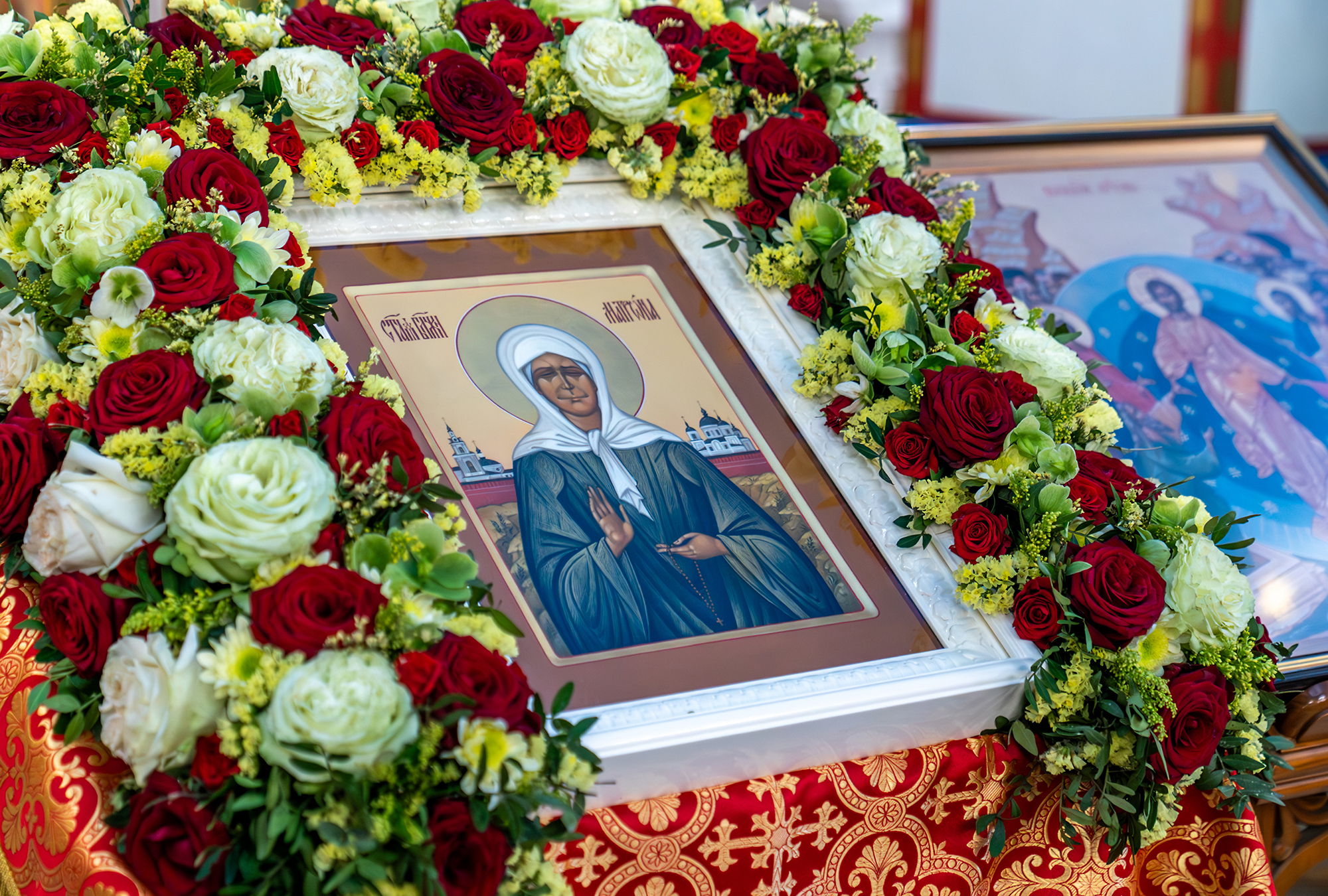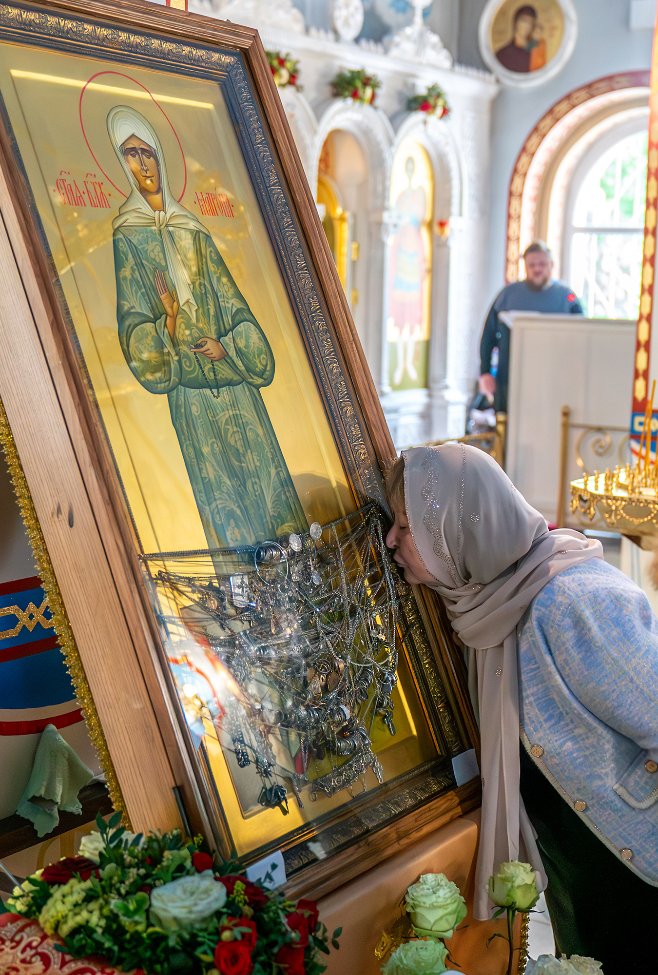 По отпусте Литургии на середине храма митрополит Леонтий с сослужащим духовенством совершил славление блаженной Матроне Московской, после пения хором тропаря и кондака, Архипастырь вознес молитву ныне прославляемой угоднице Божией.