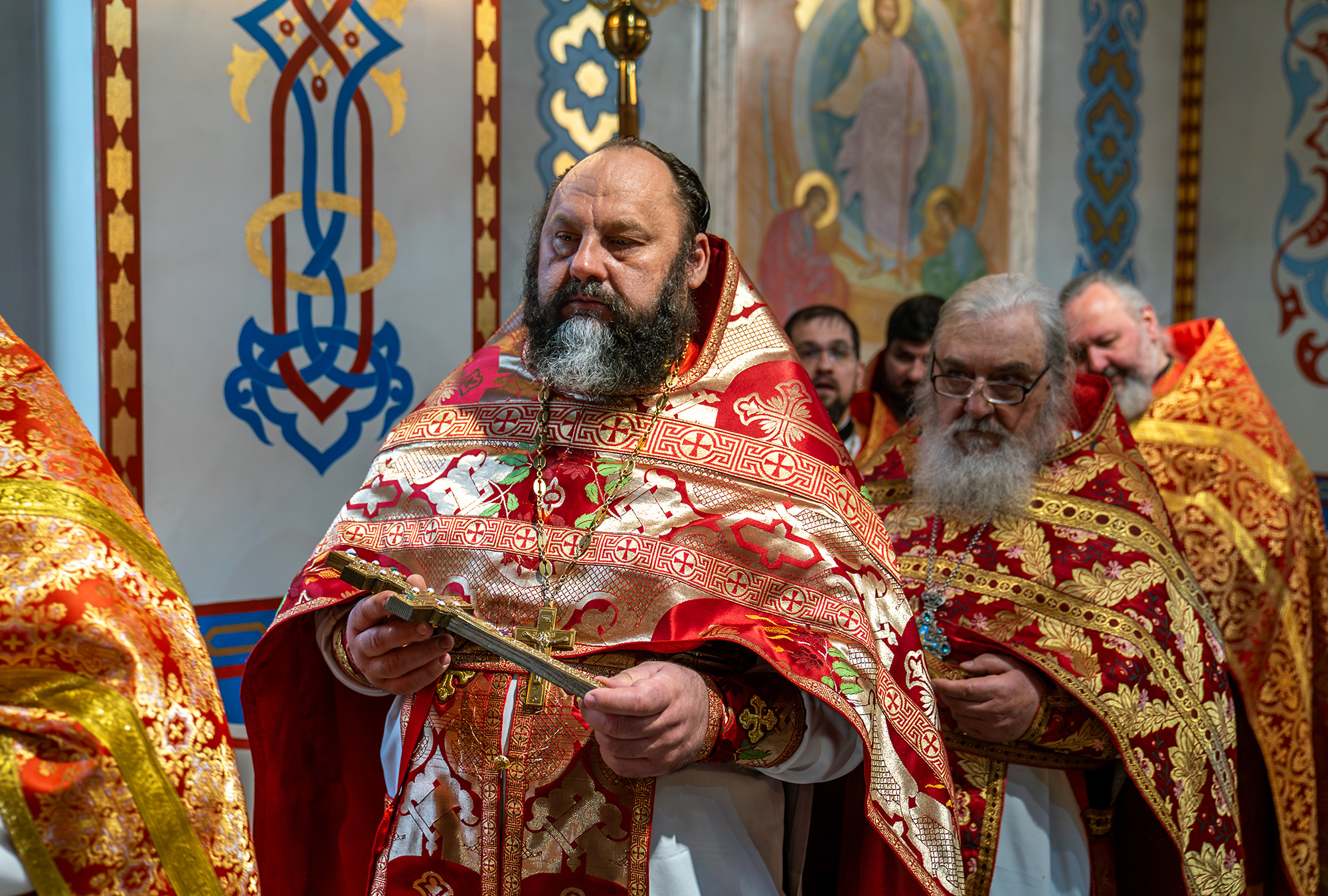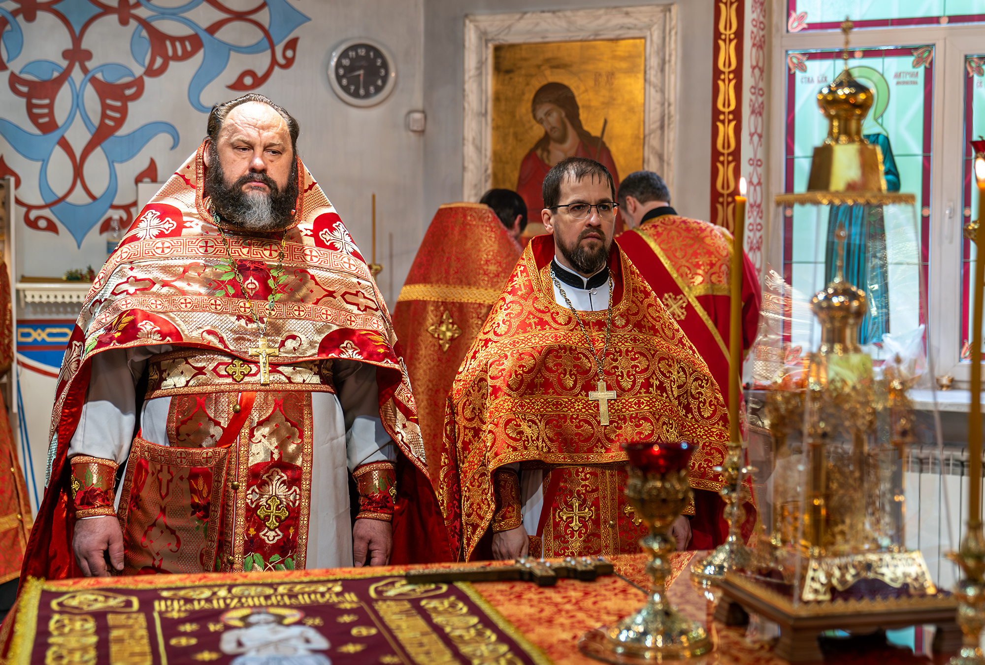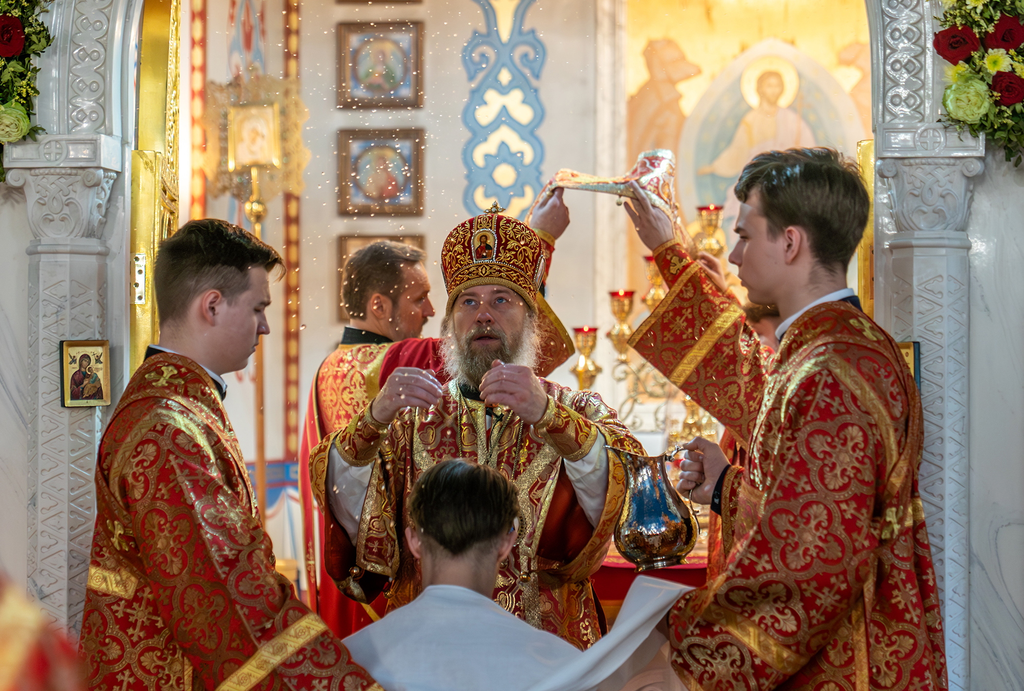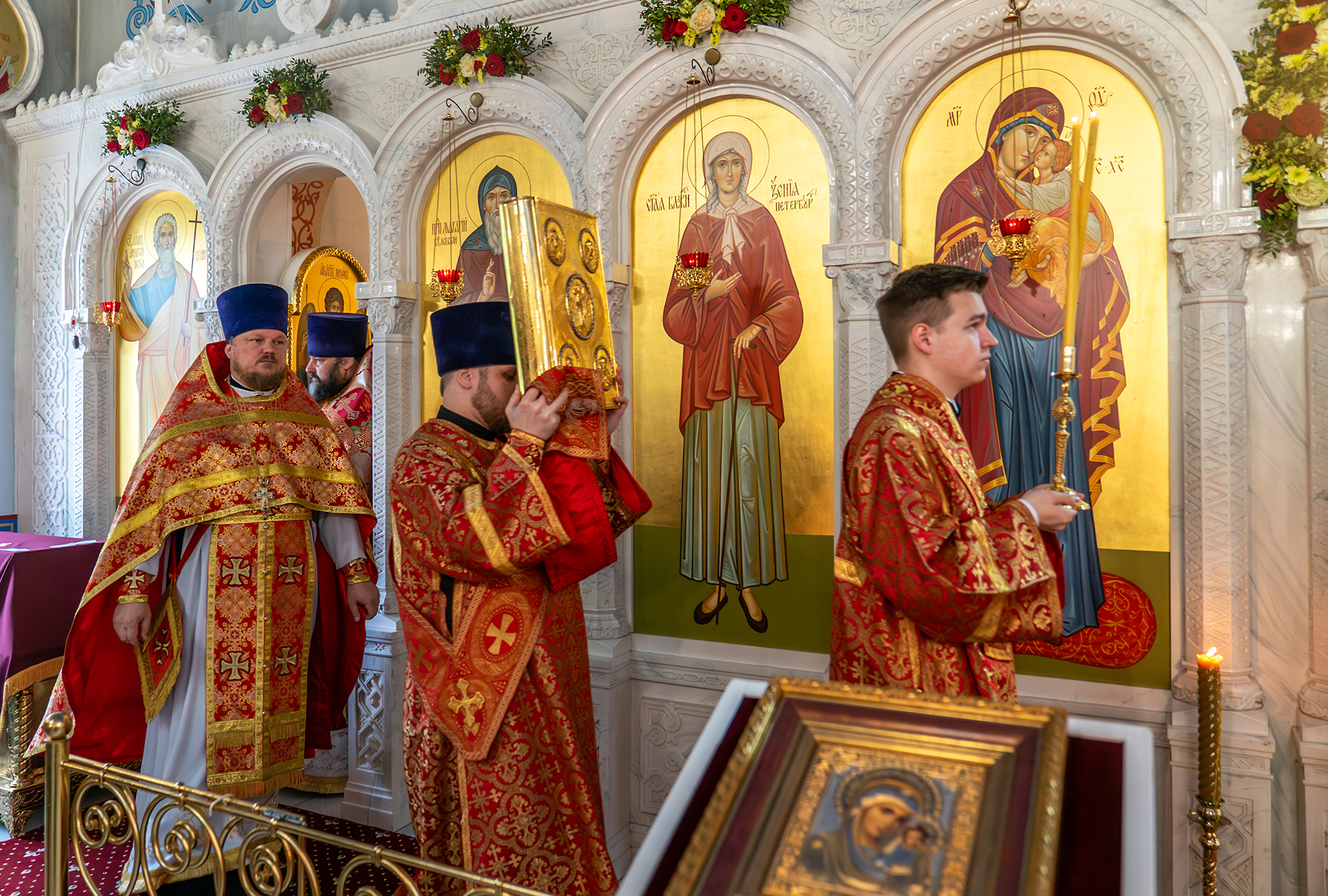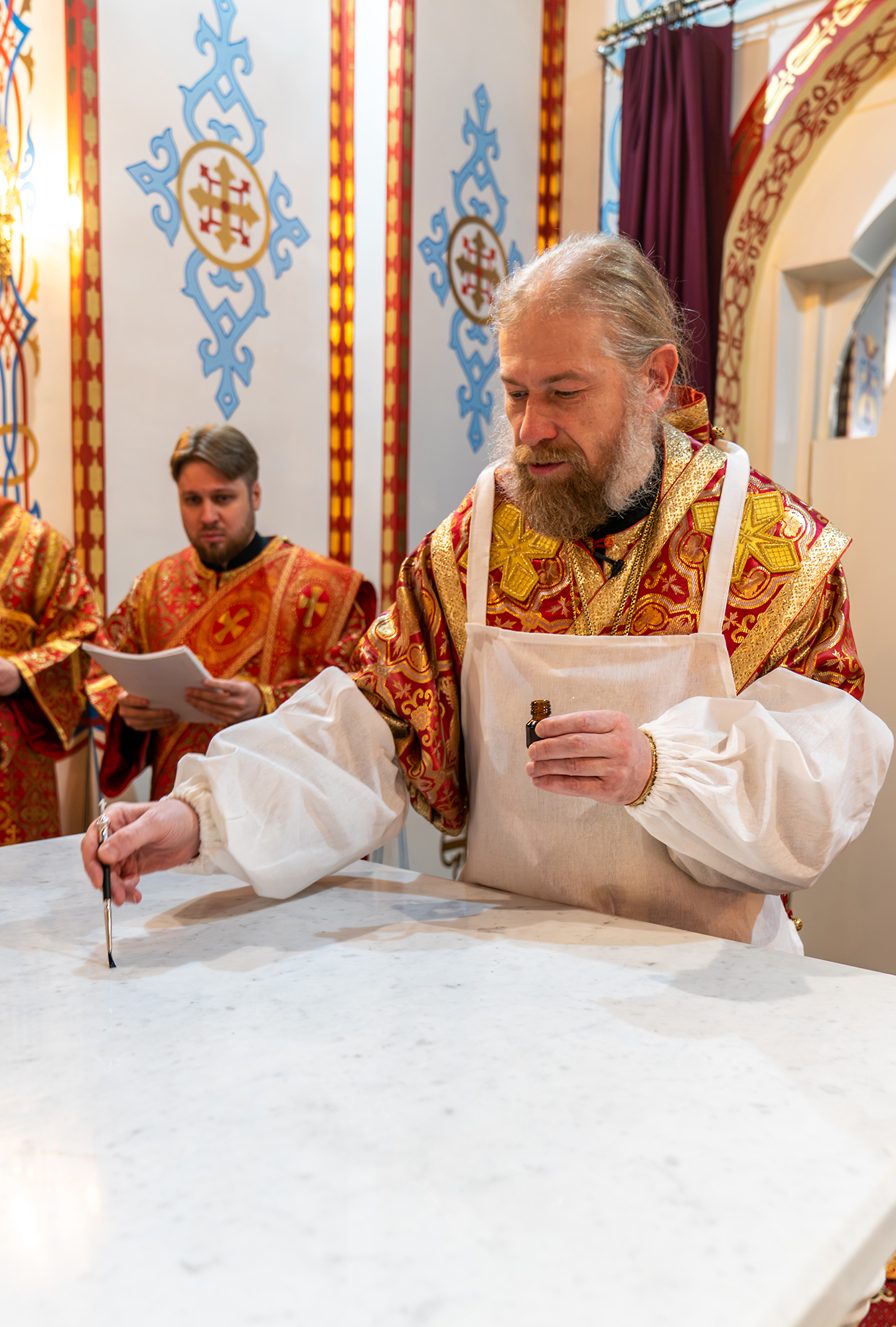 Затем Архипастырь возглавил крестный ход вокруг храма со святыми мощами. По внесении в алтарь частицы были вложены в Антиминс и в основание Престола.