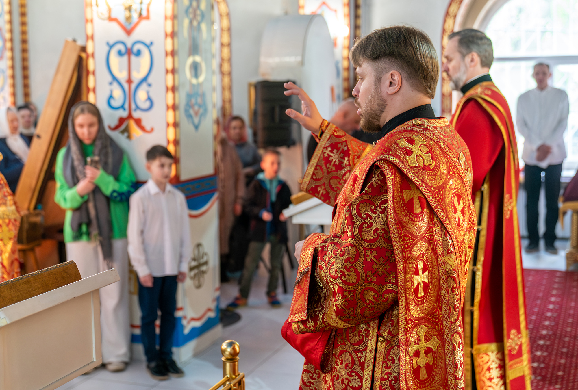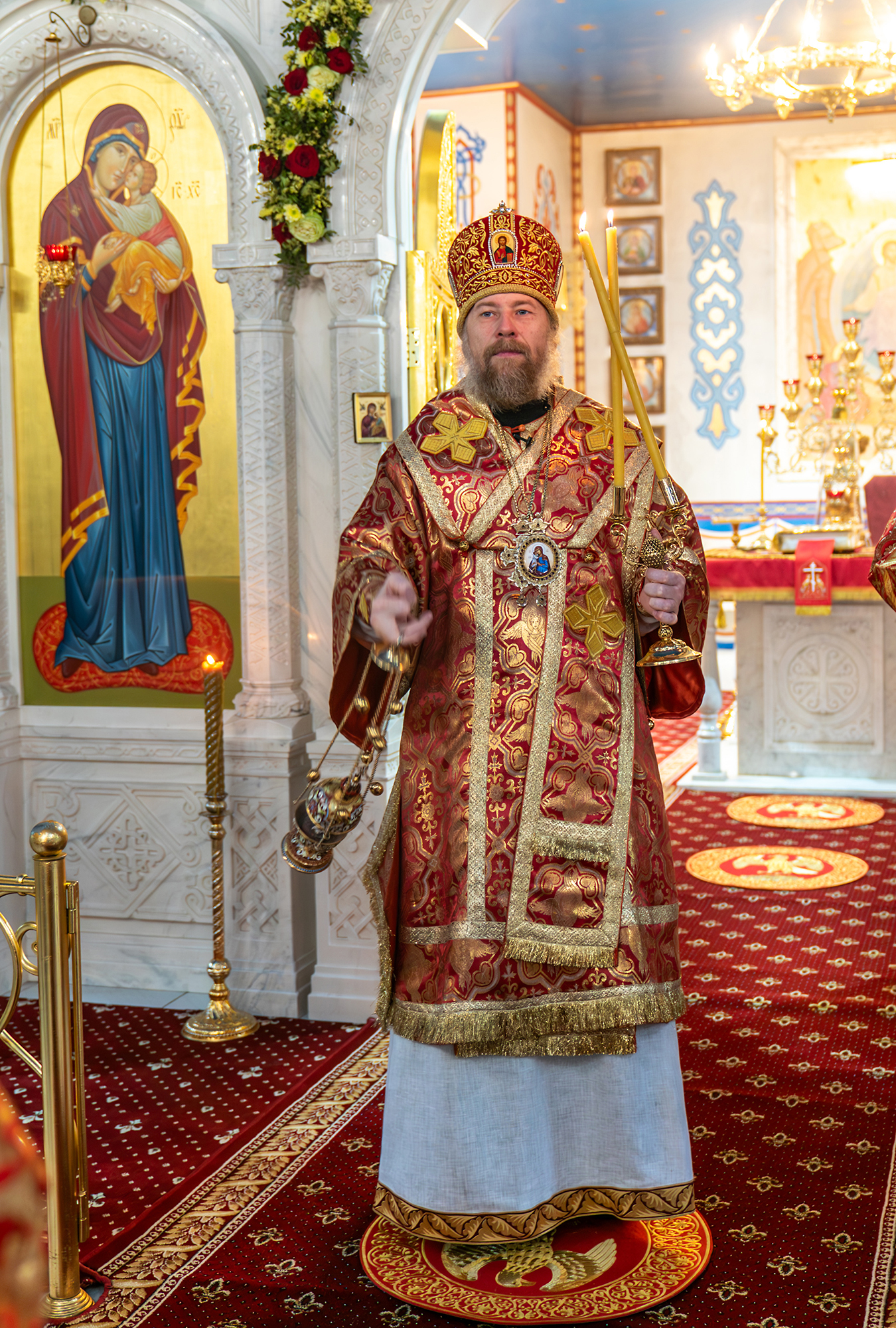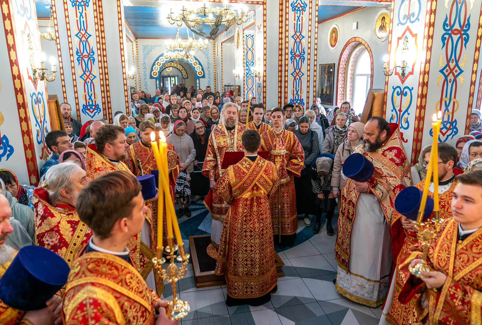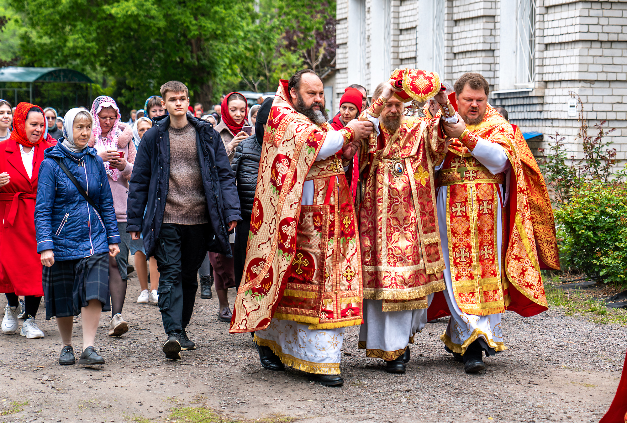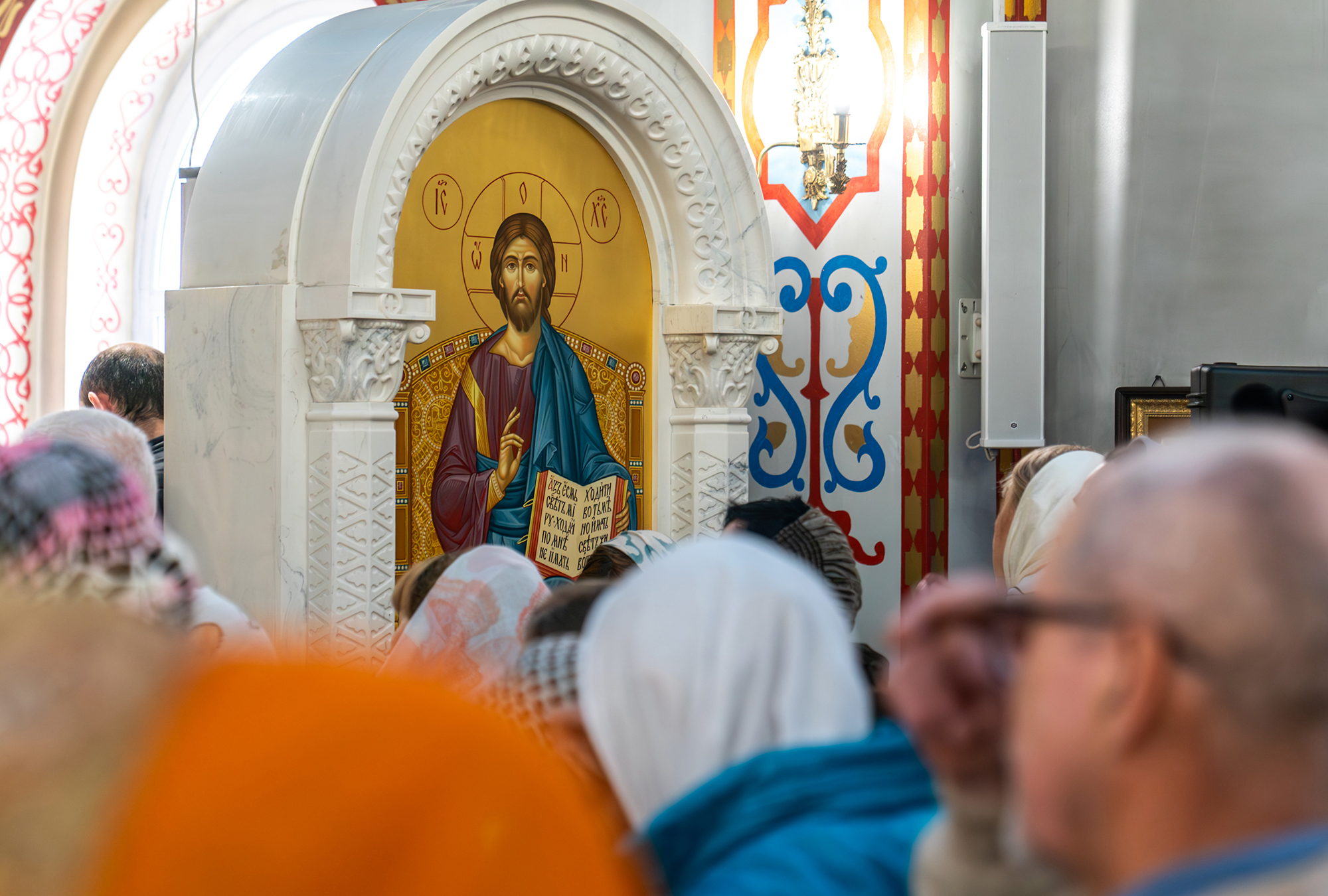 Затем Архипастырь возглавил крестный ход вокруг храма со святыми мощами. По внесении в алтарь частицы были вложены в Антиминс и в основание Престола.