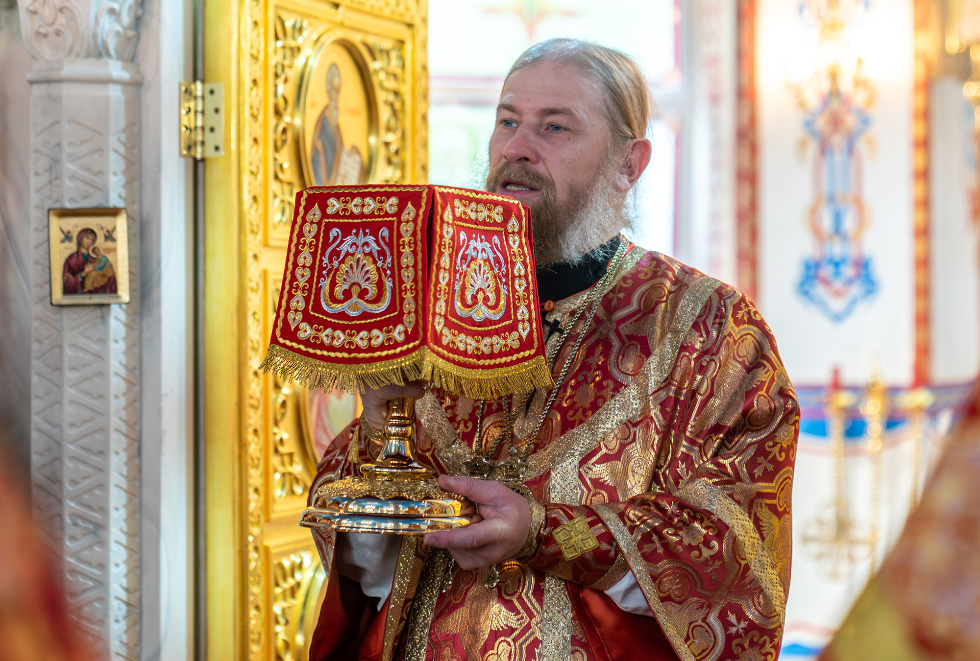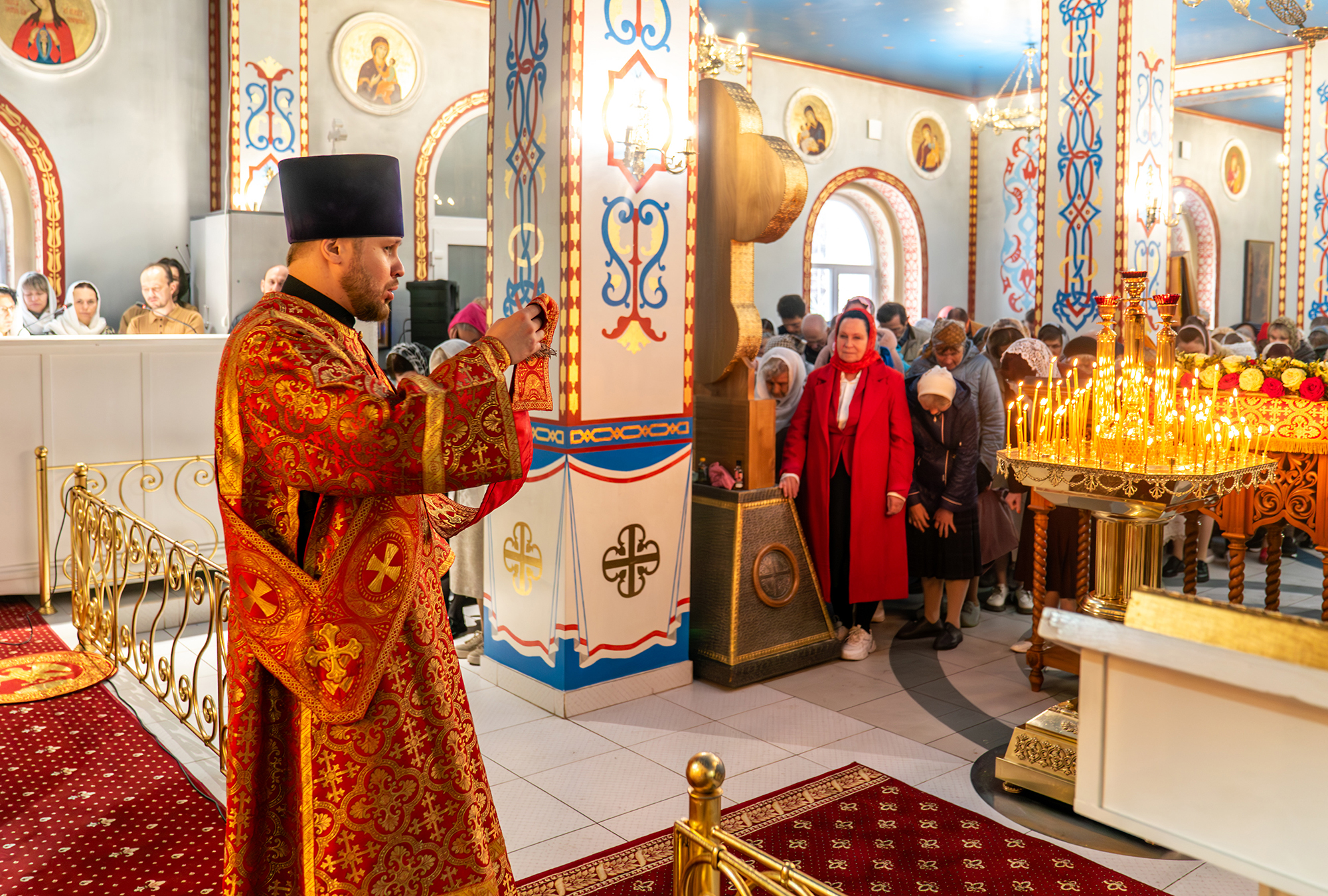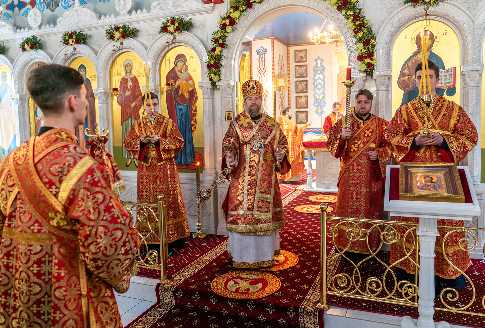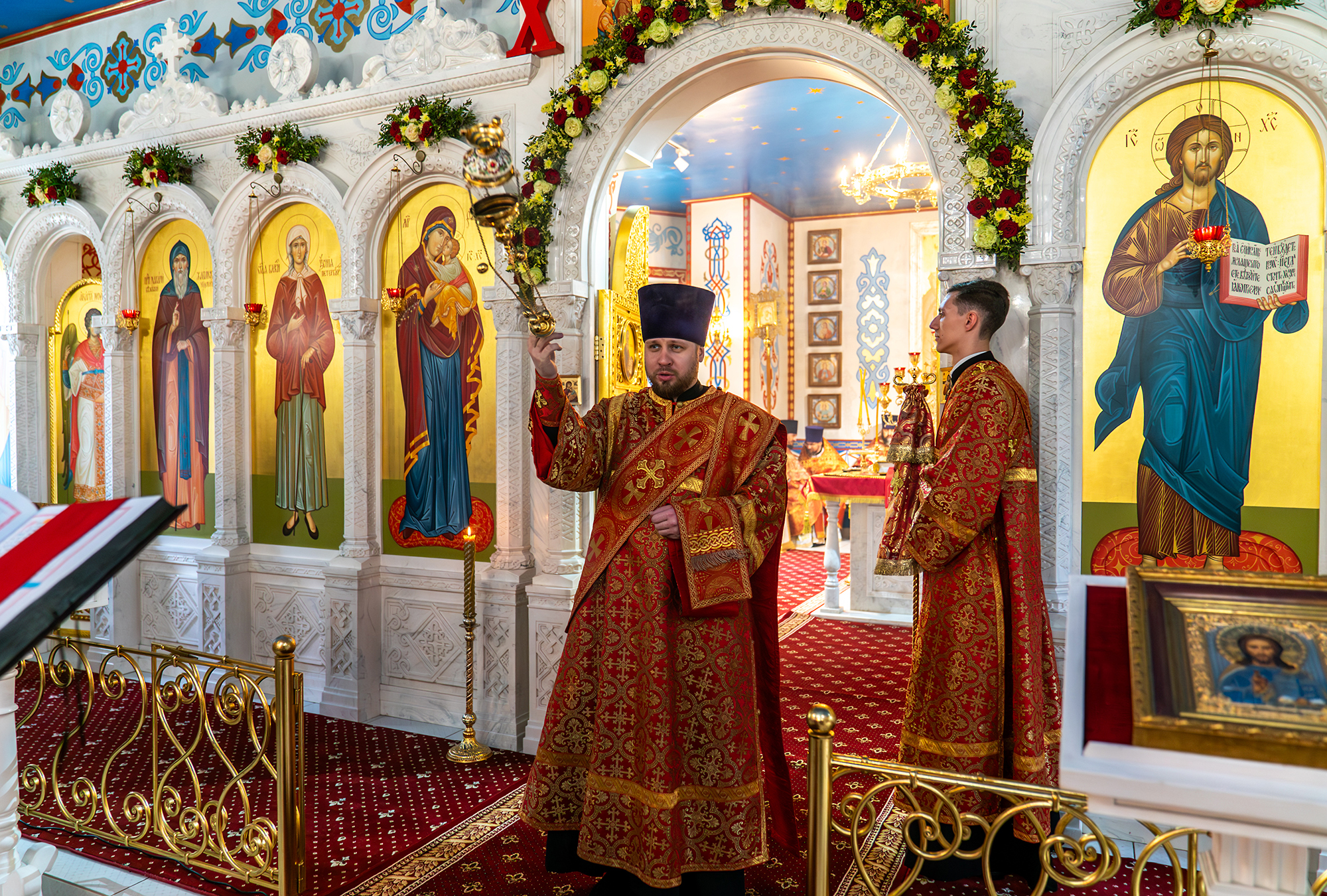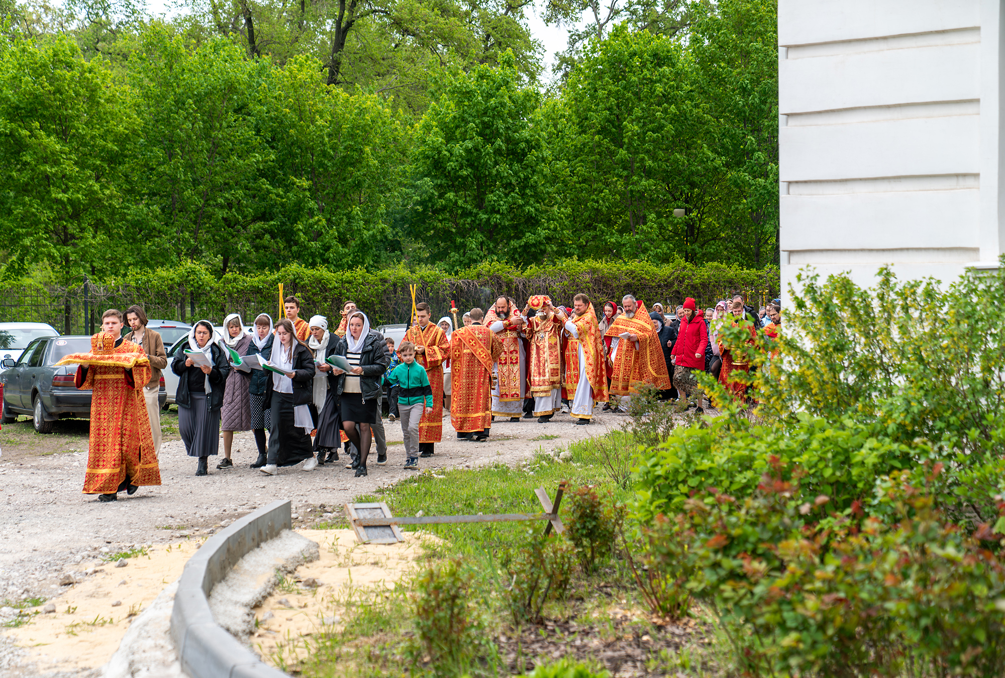 Затем Архипастырь возглавил крестный ход вокруг храма со святыми мощами. По внесении в алтарь частицы были вложены в Антиминс и в основание Престола.