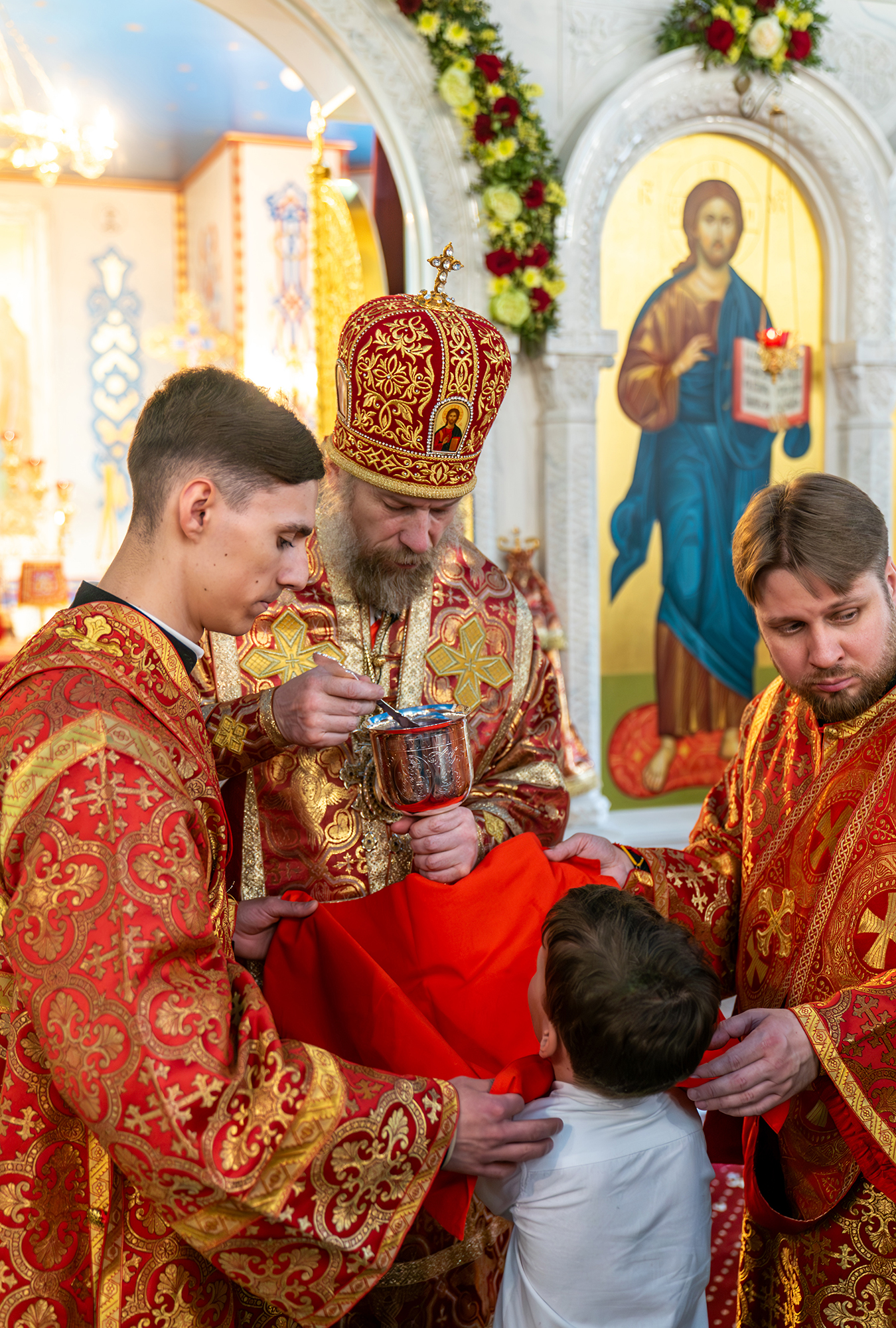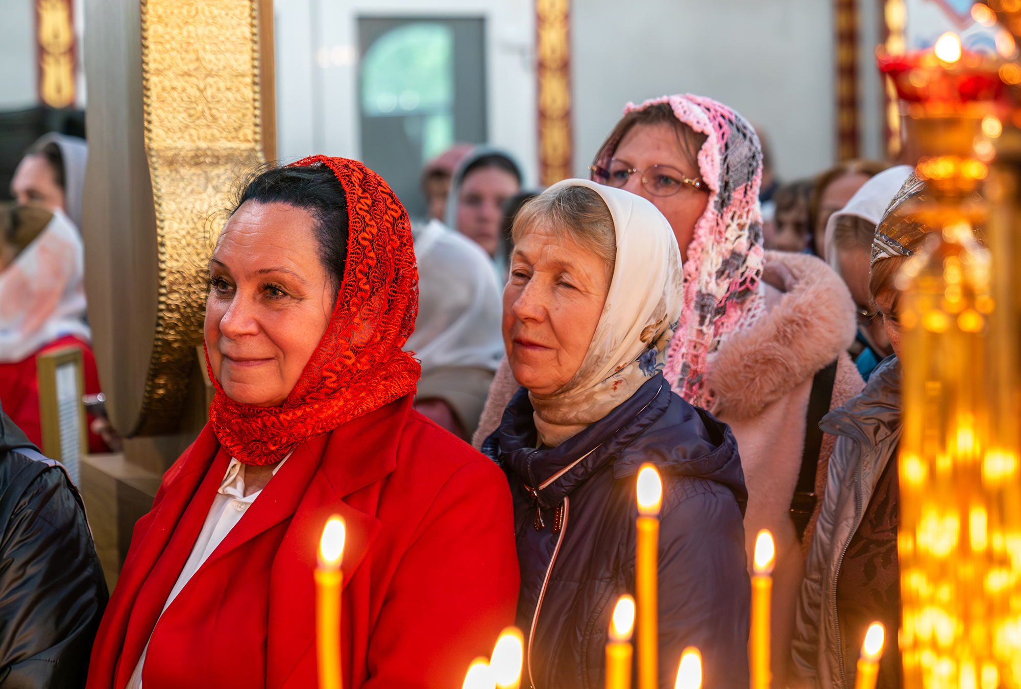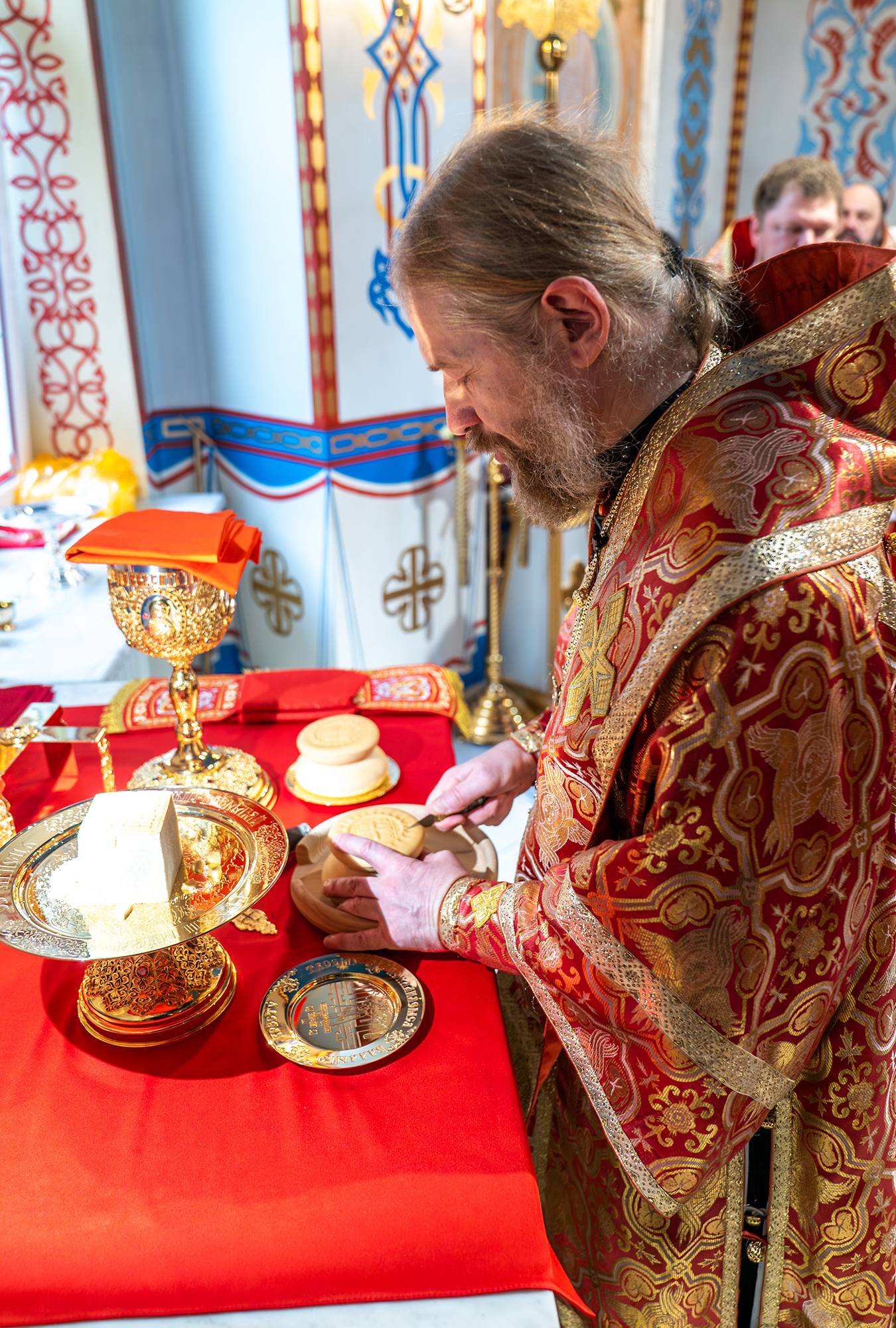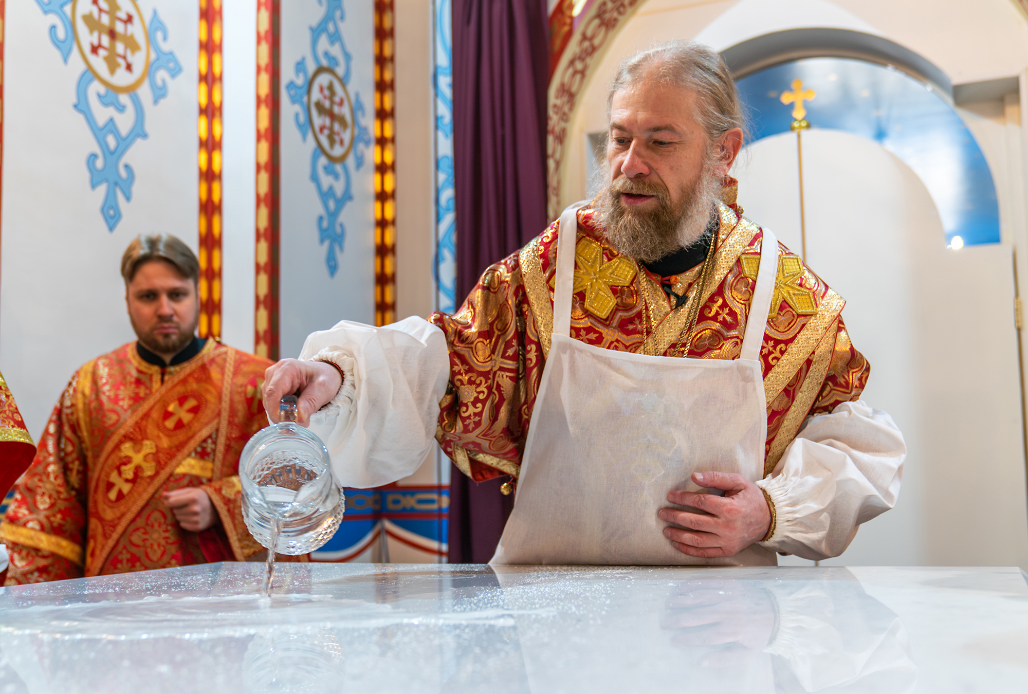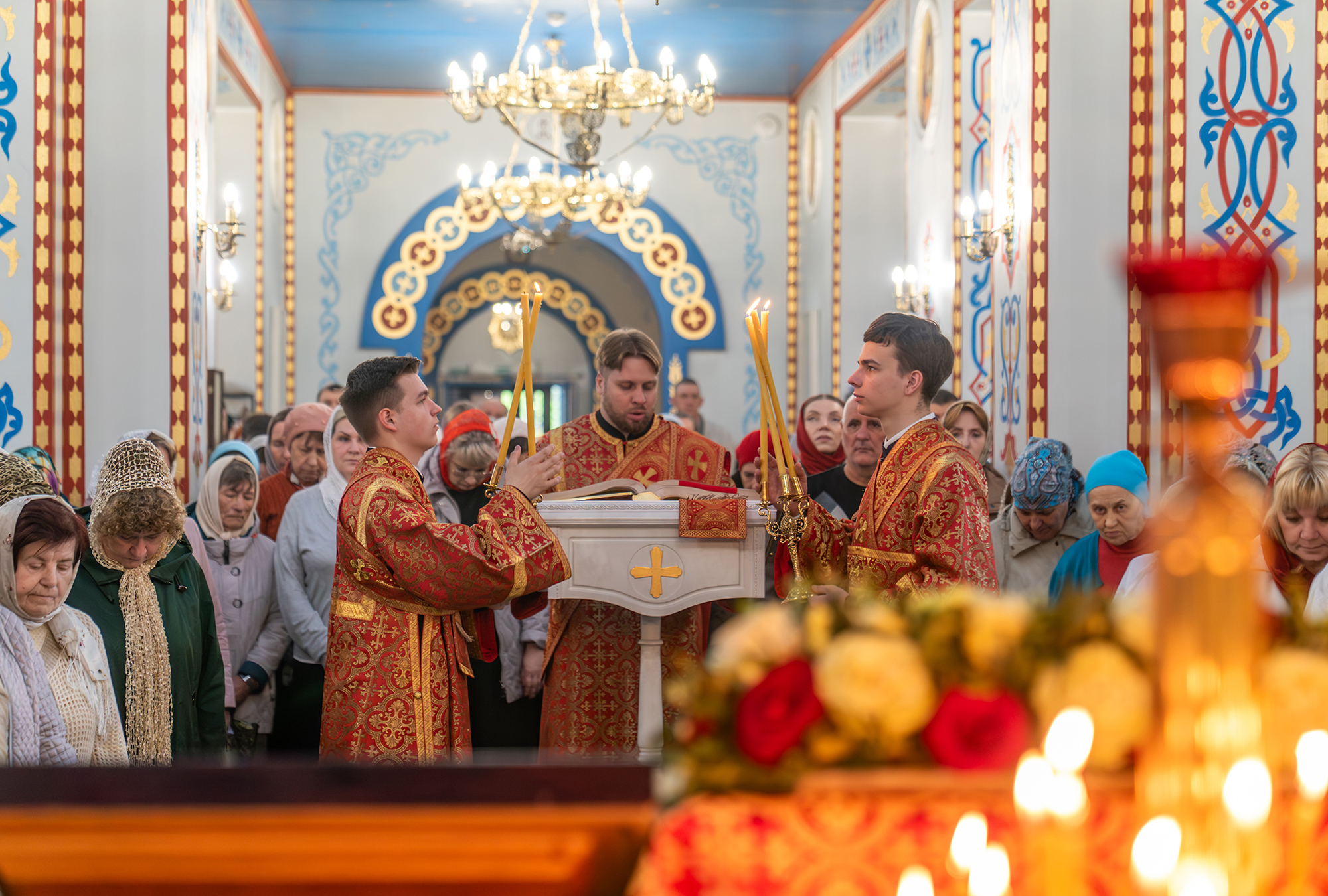Затем Архипастырь возглавил крестный ход вокруг храма со святыми мощами. По внесении в алтарь частицы были вложены в Антиминс и в основание Престола.