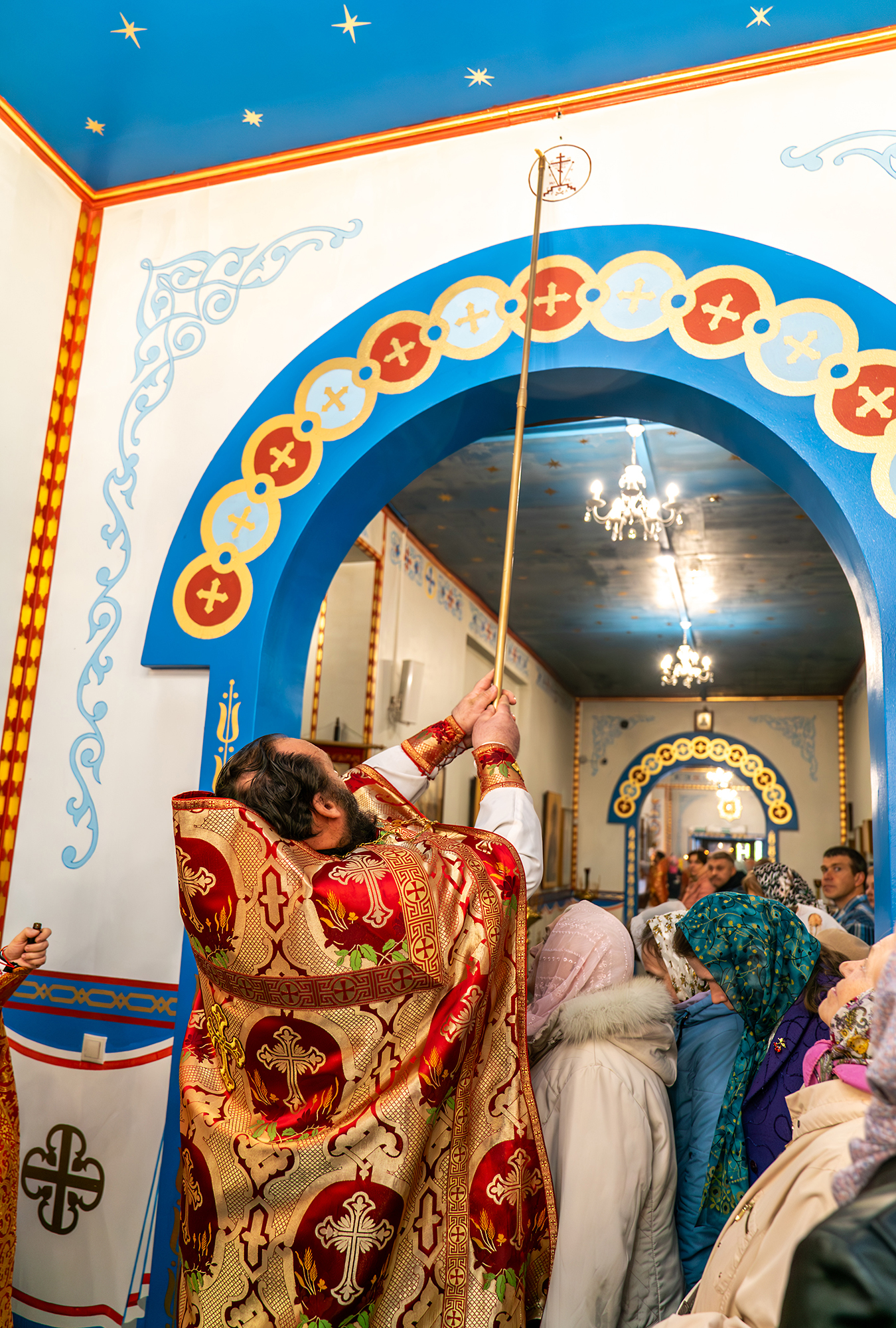 Вначале митрополит Леонтий и сослужащие клирики совершили священнодействия с главным предметом алтаря. Архипастырь помазал престол Святым Миром, затем престол и жертвенник были окроплены святой водой и одеты в священные облачения. Священнодействия чередовались чтением псалмов и особых молитв, возносимых Архиереем о новосооруженном храме и о всех в нем служащих и молящихся. Высокопреосвященнейший Владыка совершил каждение престола и всего алтаря, священники окропили стены храма святой водой и крестообразно помазали их святым Миром.