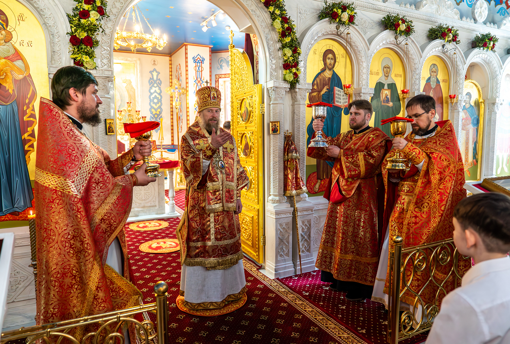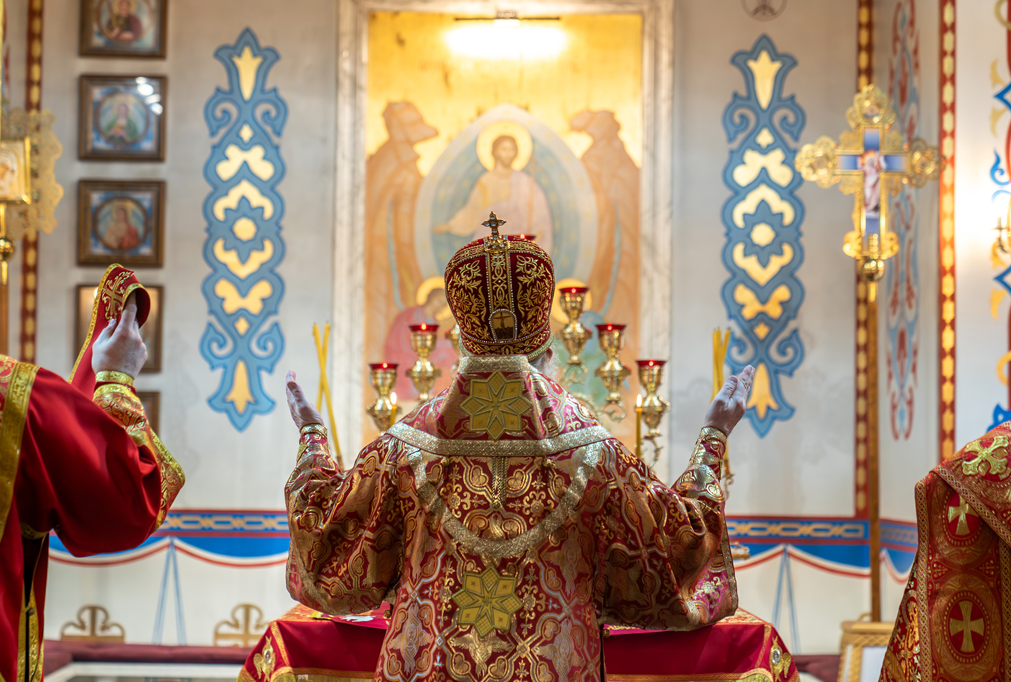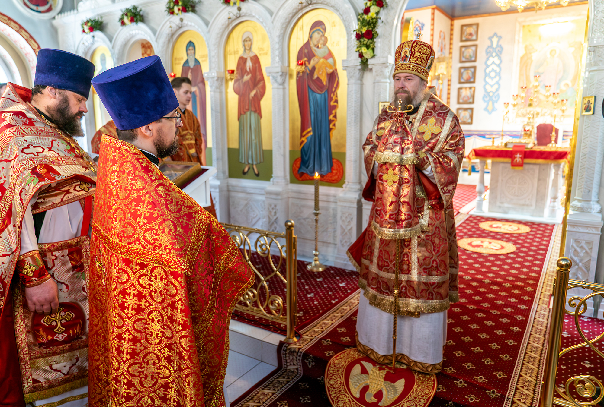 Затем Правящий Архиерей с сослужащими клириками совершил в новоосвященном храме Божественную литургию. На сугубой ектении были произнесены прошения: «…о еже прияти молитвы нас недостойных рабов Твоих в сию годину испытания, пришедшую на Русь Святую…», а также прошение о «Преосвященных архипастырях, пастырях, монашествующих и мирян земли Украинския, о единстве Церкви Христовы ревнующих, в заточении и гонениях сущих». Затем митрополит Леонтий вознес молитву о Святой Руси. По благословению Святейшего Патриарха Московского и всея Руси Кирилла эта молитва возносится во всех храмах Русской Православной Церкви.