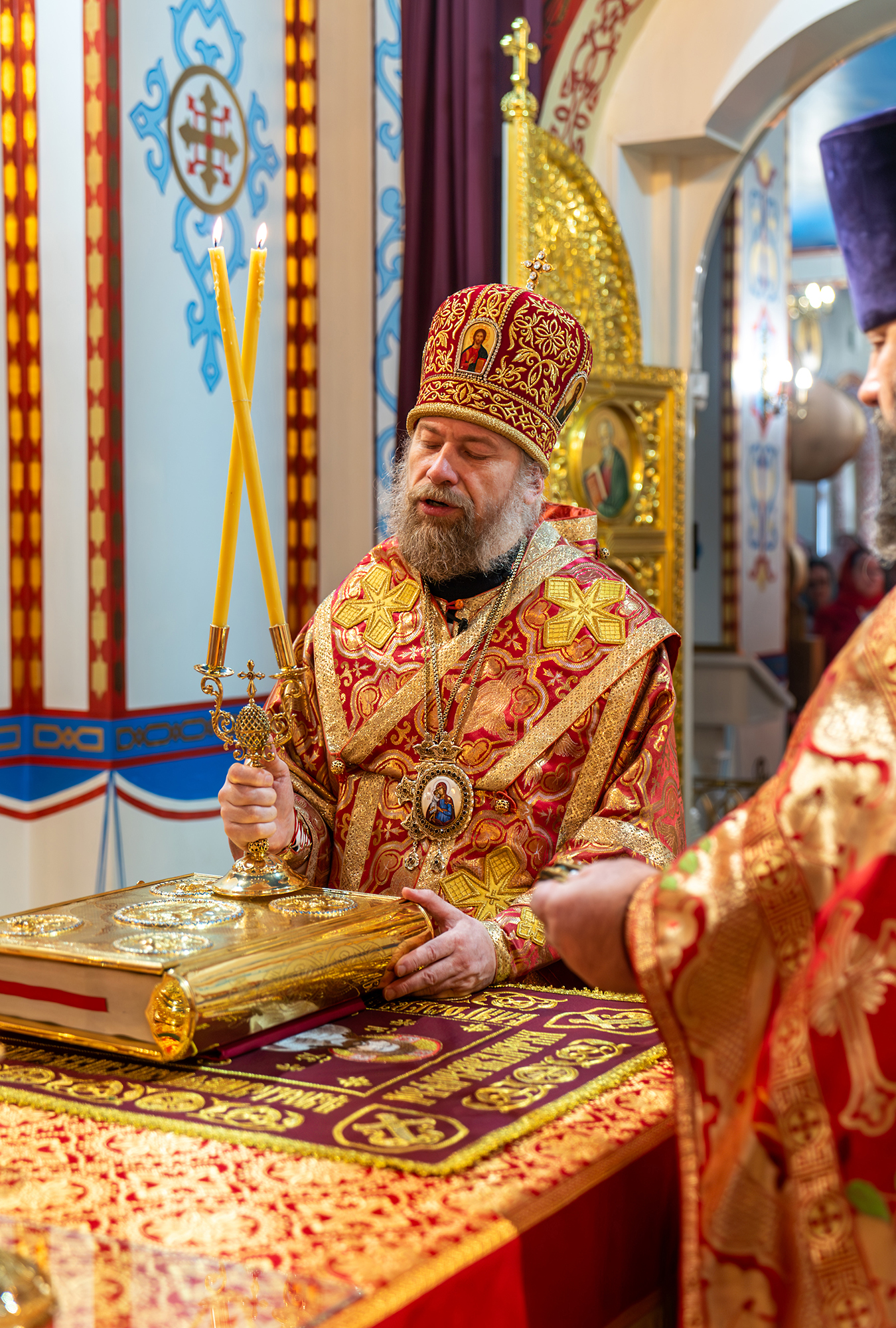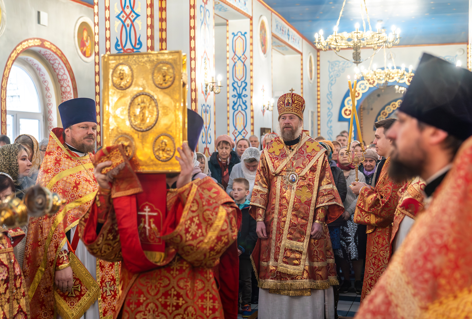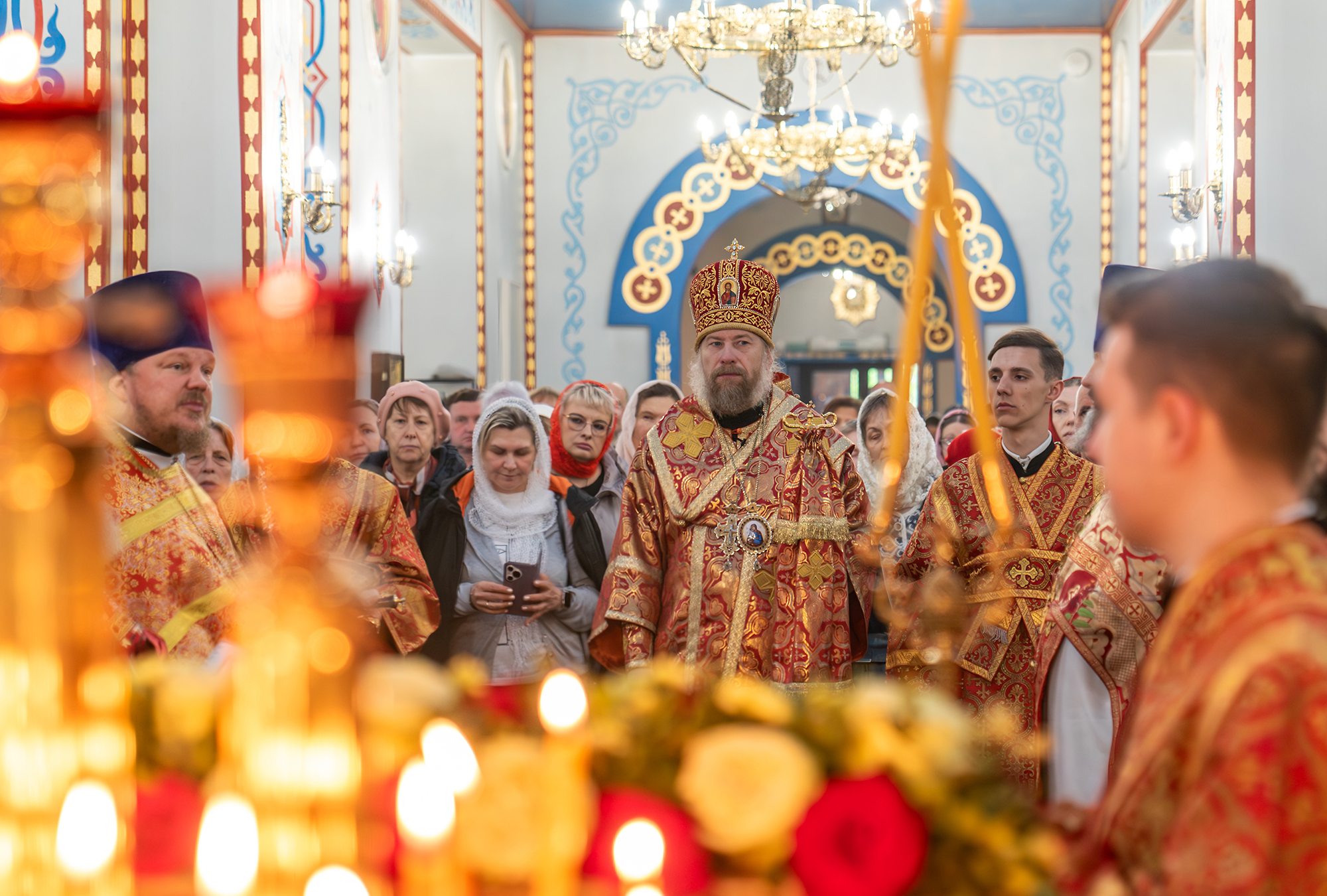 Затем Правящий Архиерей с сослужащими клириками совершил в новоосвященном храме Божественную литургию. На сугубой ектении были произнесены прошения: «…о еже прияти молитвы нас недостойных рабов Твоих в сию годину испытания, пришедшую на Русь Святую…», а также прошение о «Преосвященных архипастырях, пастырях, монашествующих и мирян земли Украинския, о единстве Церкви Христовы ревнующих, в заточении и гонениях сущих». Затем митрополит Леонтий вознес молитву о Святой Руси. По благословению Святейшего Патриарха Московского и всея Руси Кирилла эта молитва возносится во всех храмах Русской Православной Церкви.